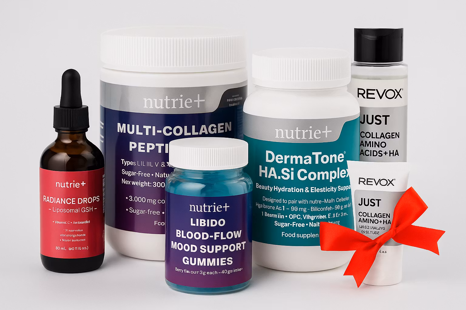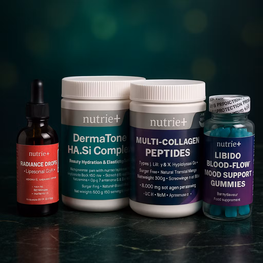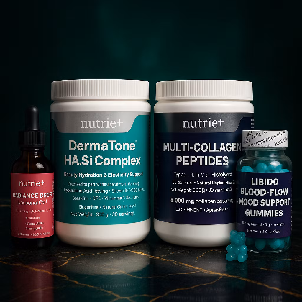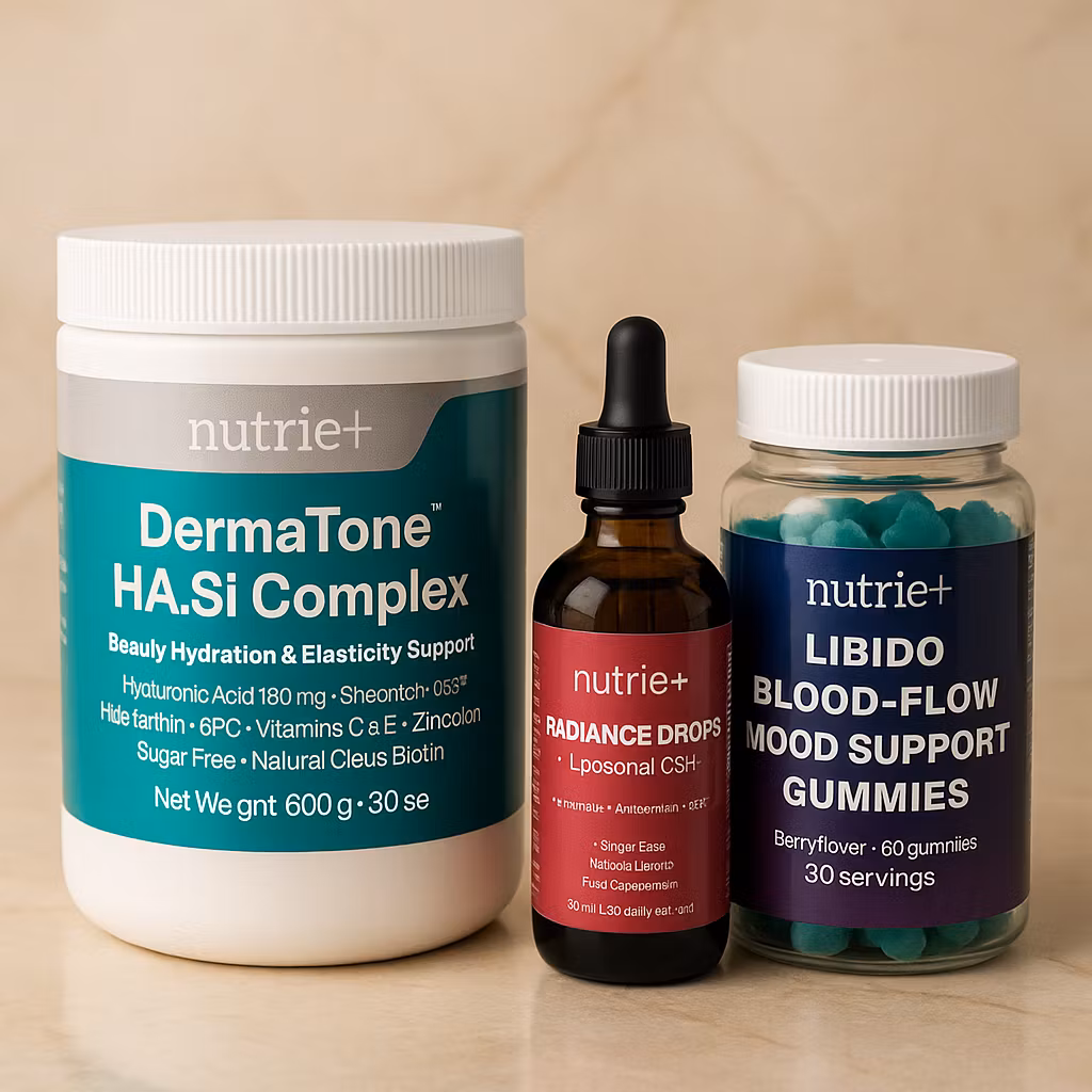 A premium 4-piece bundle for skin elasticity, collagen support, inner radiance and women’s wellness. Includes DermaTone™ HA.Si Complex, Multi-Collagen Peptides, Radiance Drops (liposomal glutathione) and Libido/Blood-Flow/Mood Gummies.