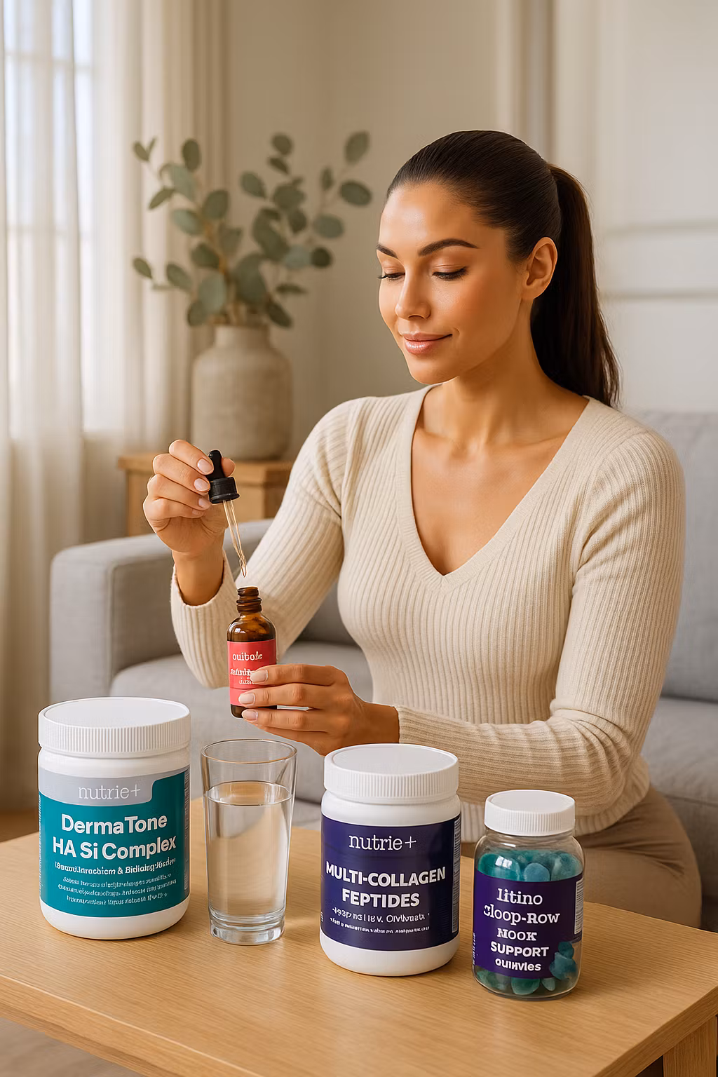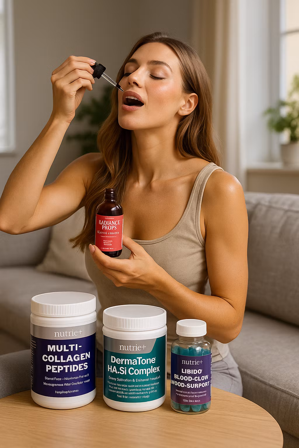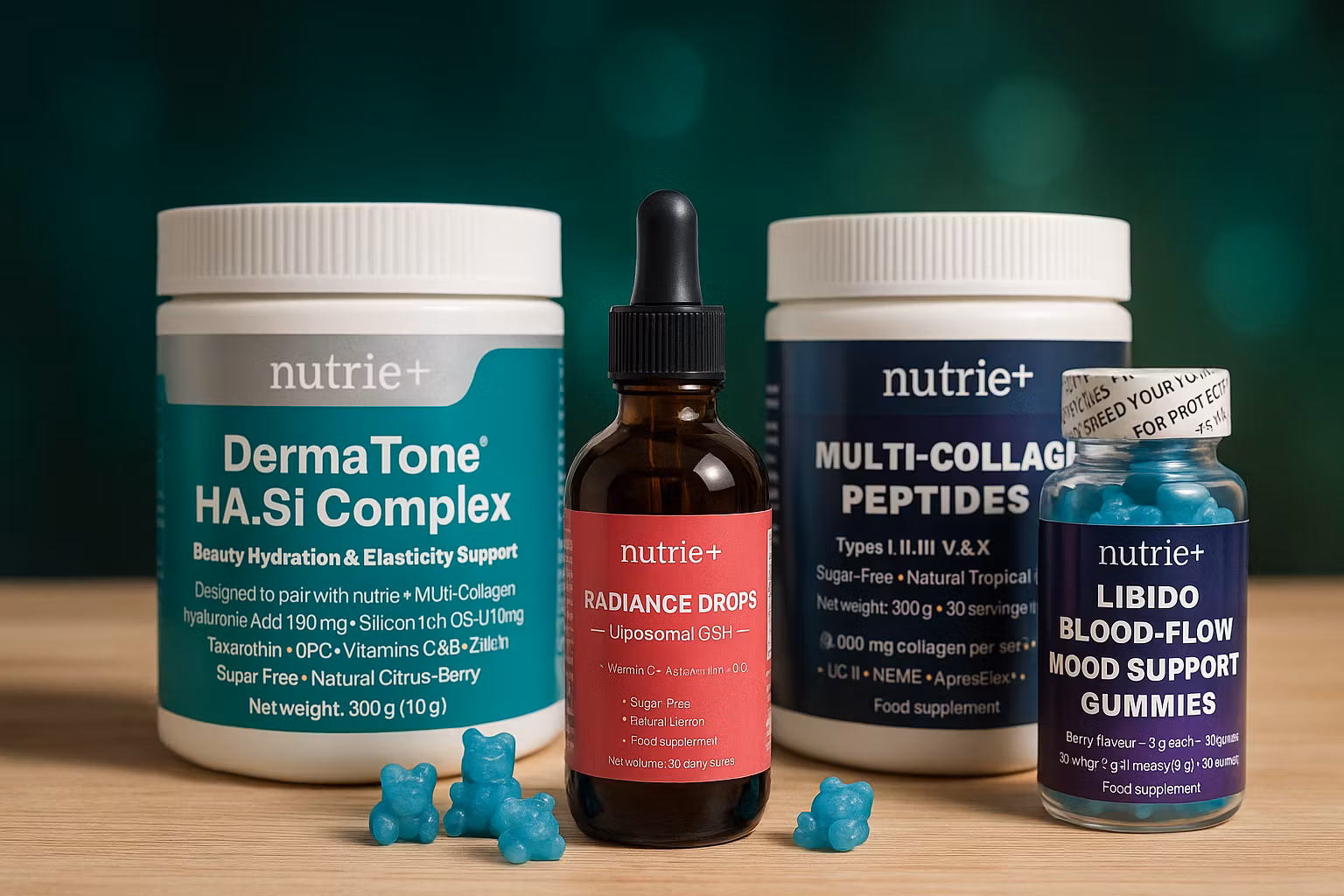 A premium 4-piece bundle for skin elasticity, collagen support, inner radiance and women’s wellness. Includes DermaTone™ HA.Si Complex, Multi-Collagen Peptides, Radiance Drops (liposomal glutathione) and Libido/Blood-Flow/Mood Gummies.