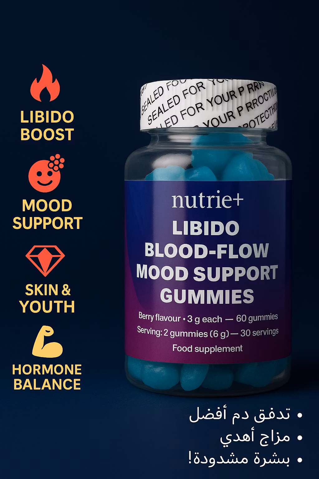 باقة فاخرة مكوّنة من ٤ منتجات هدفها دعم ترطيب البشرة ومرونتها، تعزيز الكولاجين، تفتيح داخلي، وتحسين المزاج والدورة الدموية للنساء. تحتوي على DermaTone HA.Si، مسحوق الكولاجين المتعدّد، قطرات Radiance بالجلوتاثيون الليبوزومي، وعلكات الدعم الأنثوي.