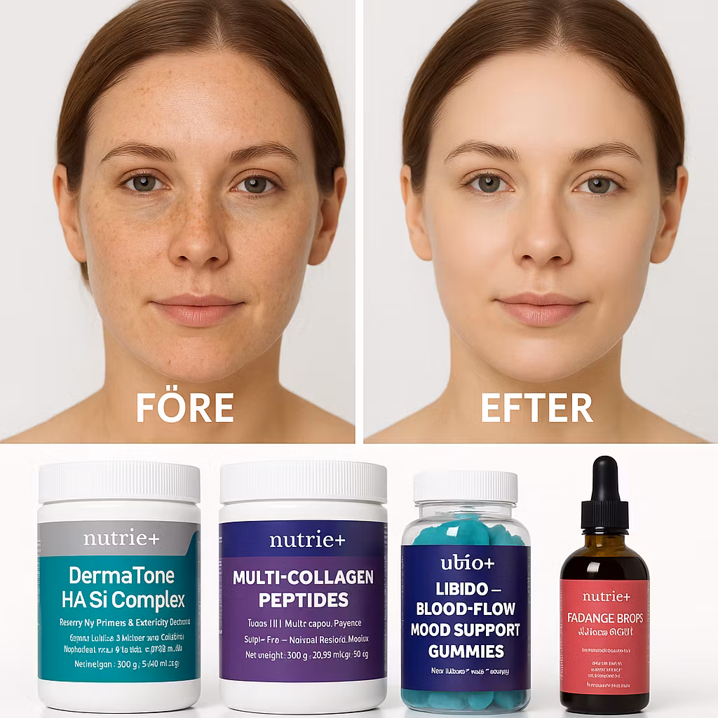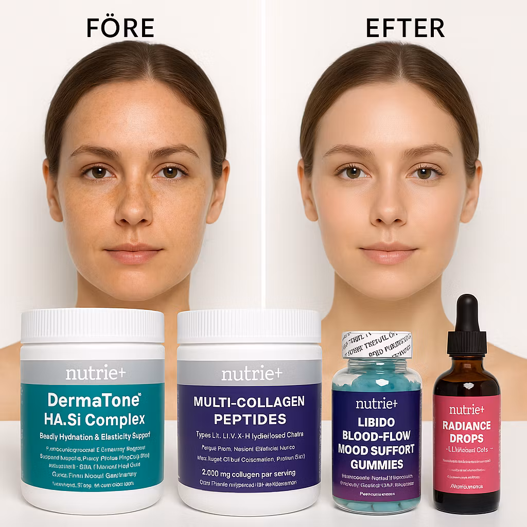 Premium 4-pack för dig som vill jobba inifrån på hud, elasticitet, lyster och kvinnligt välbefinnande. Innehåller DermaTone™ HA.Si Complex, Multi-Collagen Peptides, Radiance Drops (liposomalt glutation) och Libido/Blood-Flow/Mood Gummies. Sockerfria/sockerlåga formulas, inspirerade av svensk/EU-standard.