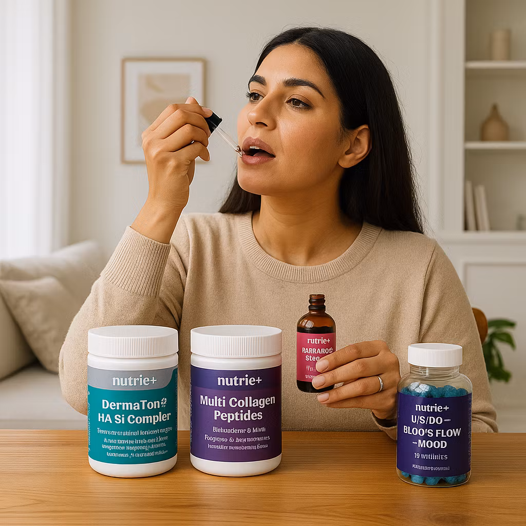 هذه الباقة مناسبة لمن تريد نتيجة واضحة وسريعة على البشرة من الداخل. منتج DermaTone يعطي حمض هيالورونيك بجرعة 180 ملغ مع سيليكون فعّال (ch-OSA)، وخلاصة بذور العنب الغنية بـ OPC، بالإضافة إلى أستازانتين وفيتاميني C وE وعنصر الزنك والنحاس والبيوتين، وكلها تدعم تكوين الكولاجين الطبيعي وحماية الخلايا من الأكسدة. مسحوق Multi-Collagen Peptides يوفّر 8 غرام كولاجين من مصادر متعددة (بحري، بقري، دجاج + UC-II®) مع مكوّنات معروفة للمفاصل والجلد مثل NEM® وAprèsFlex® والسيراموسايدز وهيالورونيك أسيد وفيتامين C، وهذا يعطي دعماً للجسم والبشرة معاً. قطرات Radiance تحتوي 750 ملغ جلوتاثيون مخفّض بصيغة ليبوزومية تساعد على اللمعان، توحيد اللون، ودعم مضادات الأكسدة. العلكات فيها L-سيترولين، ماكا، أشواجندا، جنسنج، خلاصة العنب، لحاء الصنوبر الفرنسي، ومعها زنك يساهم في الخصوبة الطبيعية – فتفيد المزاج والدورة الدموية. يُستعمل يومياً، ولا يُعتبر بديلاً عن الغذاء المتوازن، ويُحفظ بعيداً عن متناول الأطفال.